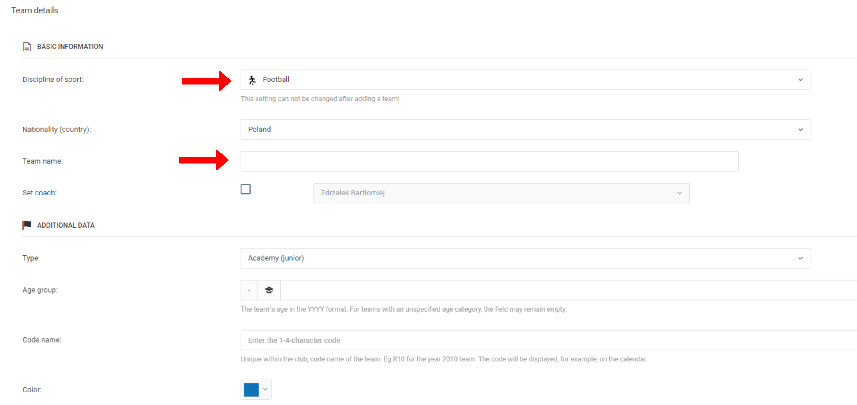 Crear un equipo es un elemento necesario para comenzar a trabajar. Para crear un equipo, haga clic en el botón del menú izquierdo: diario equipo crear nuevo equipo. En el formulario de creación de equipo, tiene algunos campos importantes para completar. El más importante es la disciplina y el nombre del equipo. Determina la visualización posterior del nombre de nuestro equipo en muchos lugares del diario. En el campo Nombre del club, seleccione el club específico al que pertenece el equipo. Si su club no está en la lista, puede agregarlo manualmente ingresando su nombre oficial y logo. El siguiente paso es especificar el grupo de edad de su equipo, dar un nombre abreviado del equipo y especificar un color, utilizándolo para distinguir los equipos en el calendario del club.